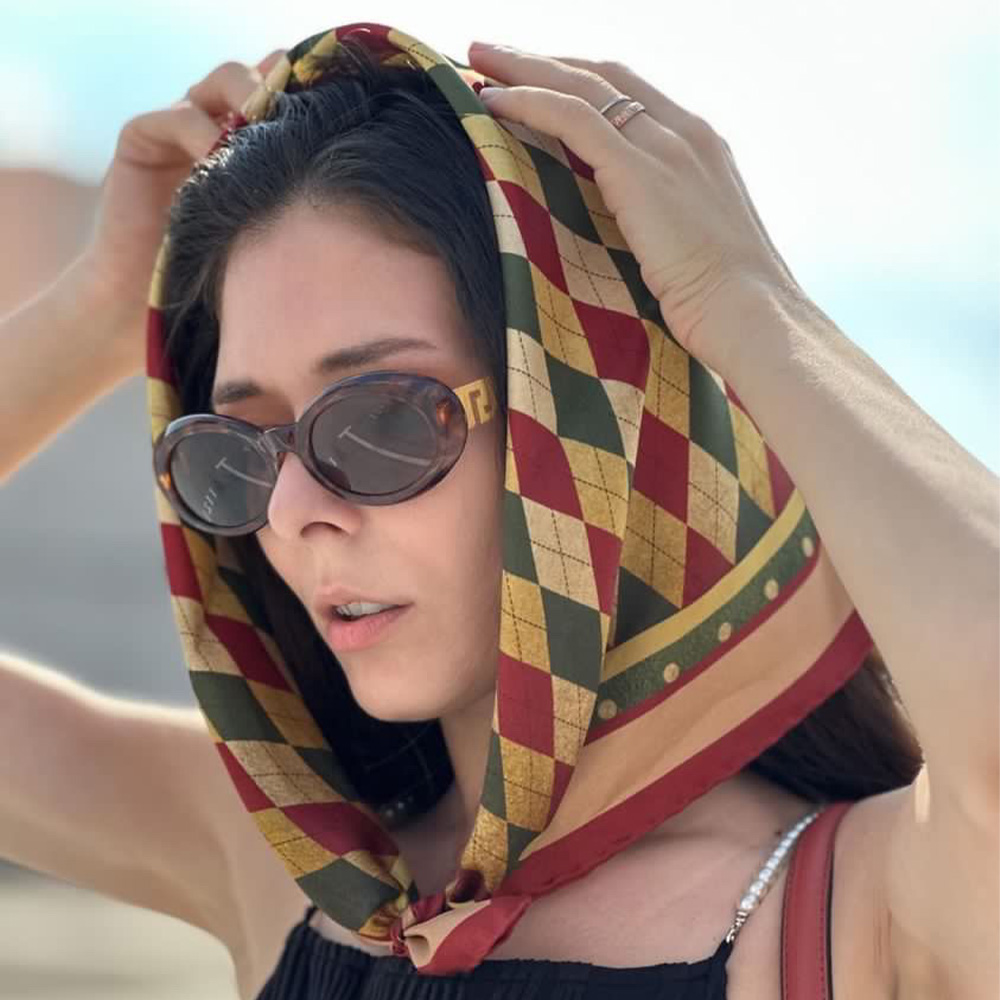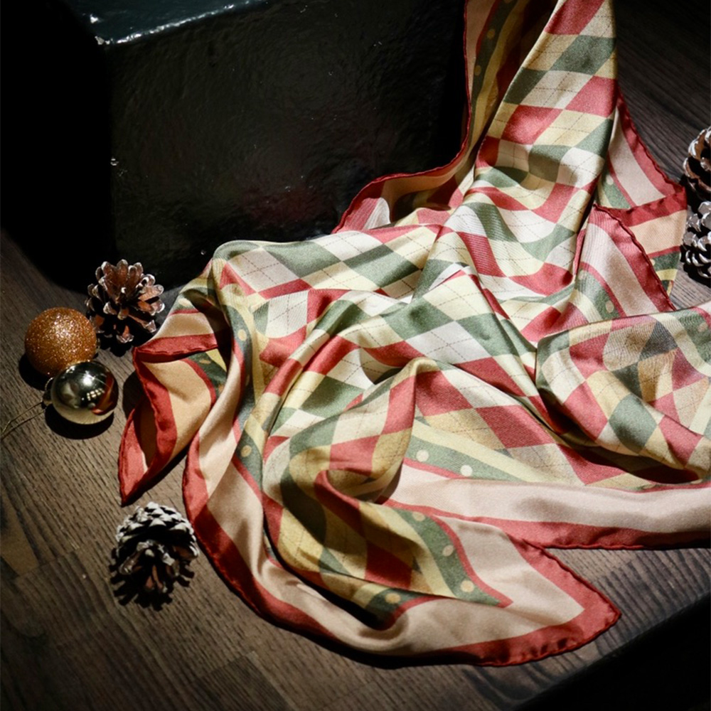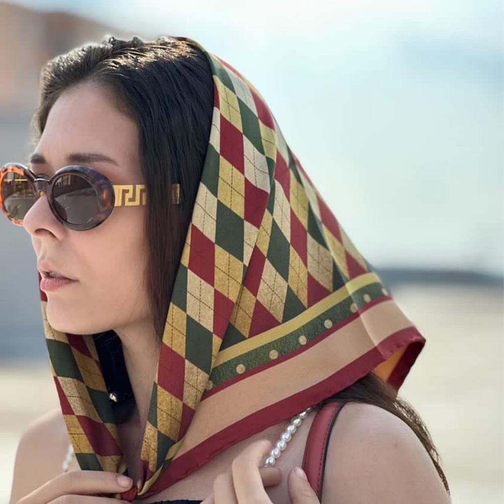 Eșarfa din mătase naturală – Arlequin Vintage celebrează farmecul teatral și eleganța atemporală, inspirându-se din lumea fascinantă a commedia dell’arte. Cu un model geometric vibrant și culori retro – roșu, auriu și verde –, această piesă realizată din 100% mătase naturală tip twill devine un manifest al expresivității și rafinamentului personal. Ideală pentru cei care iubesc accesoriile cu poveste, rafinate și pline de personalitate
