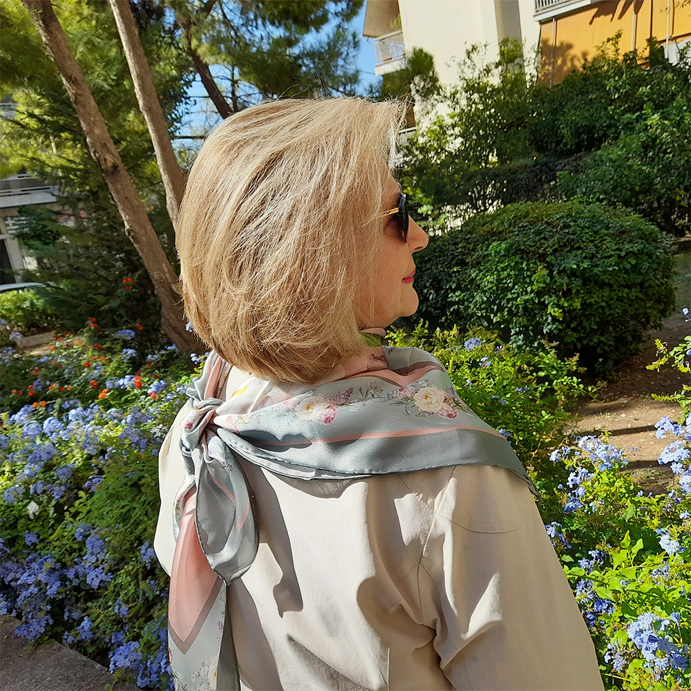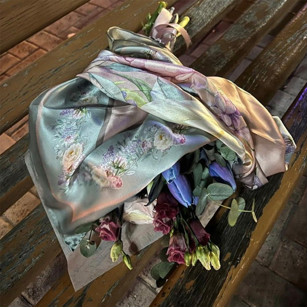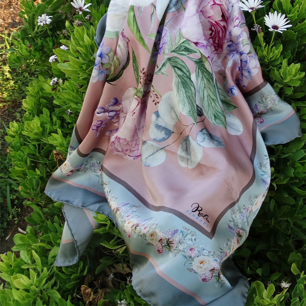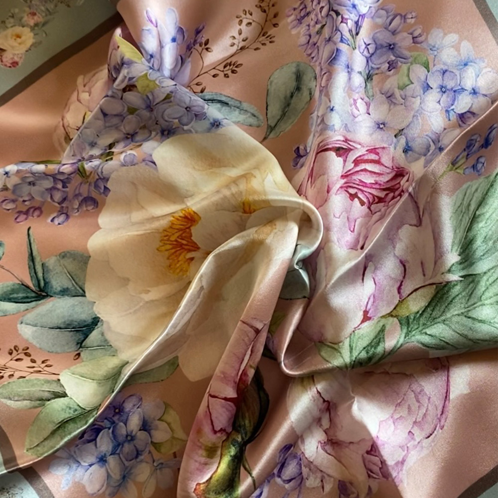 Ravishing Peonies este mai mult decât o eșarfă – este un buchet de flori pictat în mătase, o simfonie vizuală în care bujorii albi, liliacul pastel și frunzele de eucalipt își spun povestea. Realizată din 100% mătase naturală satinată, această piesă adaugă un strat de poezie și eleganță atemporală oricărei ținute. Perfectă pentru femeia care nu caută doar frumusețe, ci și sens.